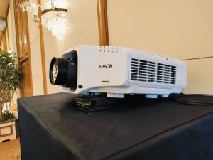 ステージ上に180インチのスクリーンを吊り、対面から高輝度のプロジェクターで